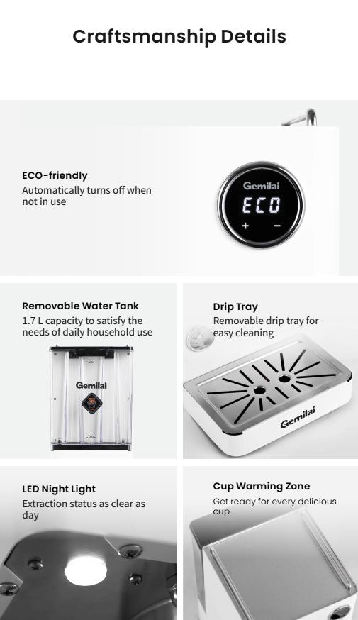 Constructed with a stainless steel body, the G3007Z combines durability and elegance, while adjustable temperature and pressure controls let you tailor each brew to your taste. Its built-in steam wand produces micro-foam for lattes, cappuccinos and other specialty drinks, and the removable 1.7 L water reservoir and drip tray make daily use and maintenance simple.