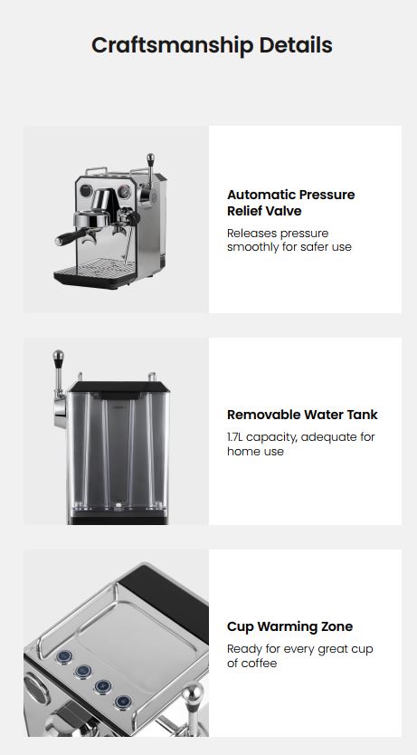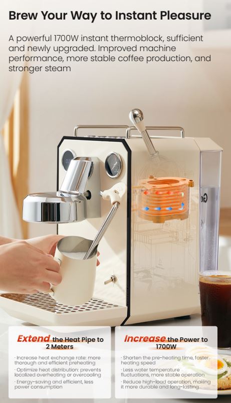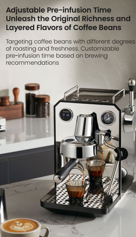 At its core is a 15‑bar commercial‑grade pump and robust 1500W heating system that delivers stable pressure and optimal temperature for full‑bodied espresso extraction. A generous 1.7 L removable water tank and 58 mm commercial brewing group ensure reliable performance shot after shot. Adjustable settings for pre‑infusion time, temperature, and brewing duration give you the control needed to dial in your ideal flavour profile.