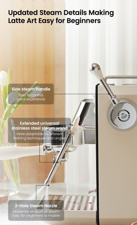 A modern dual display puts pressure, temperature, and extraction time at your fingertips, while a swivel steam wand with a dual‑hole nozzle makes textured milk for lattes and cappuccinos effortless. Practical touches like automatic pressure release, a detachable drip tray, and easy‑to‑clean components mean less maintenance and more enjoyment